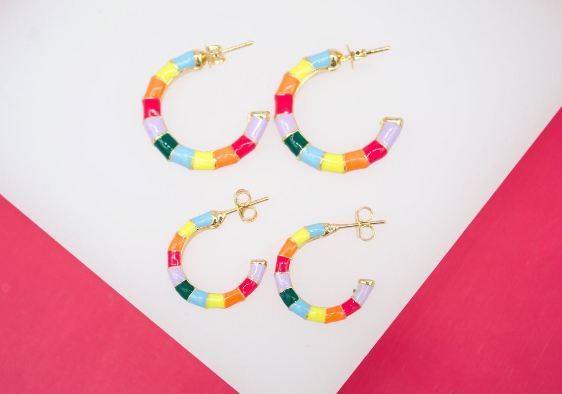 Experience boldness and adventure with our 18K Gold Filled Colorful Enamel Open Hoop Stud Earrings (L55)! These stunning earrings feature a vibrant array of colors and a unique open hoop design, perfect for adding a touch of risk-taking to any outfit. Get ready to turn heads and make a statement with our earrings on your ears.