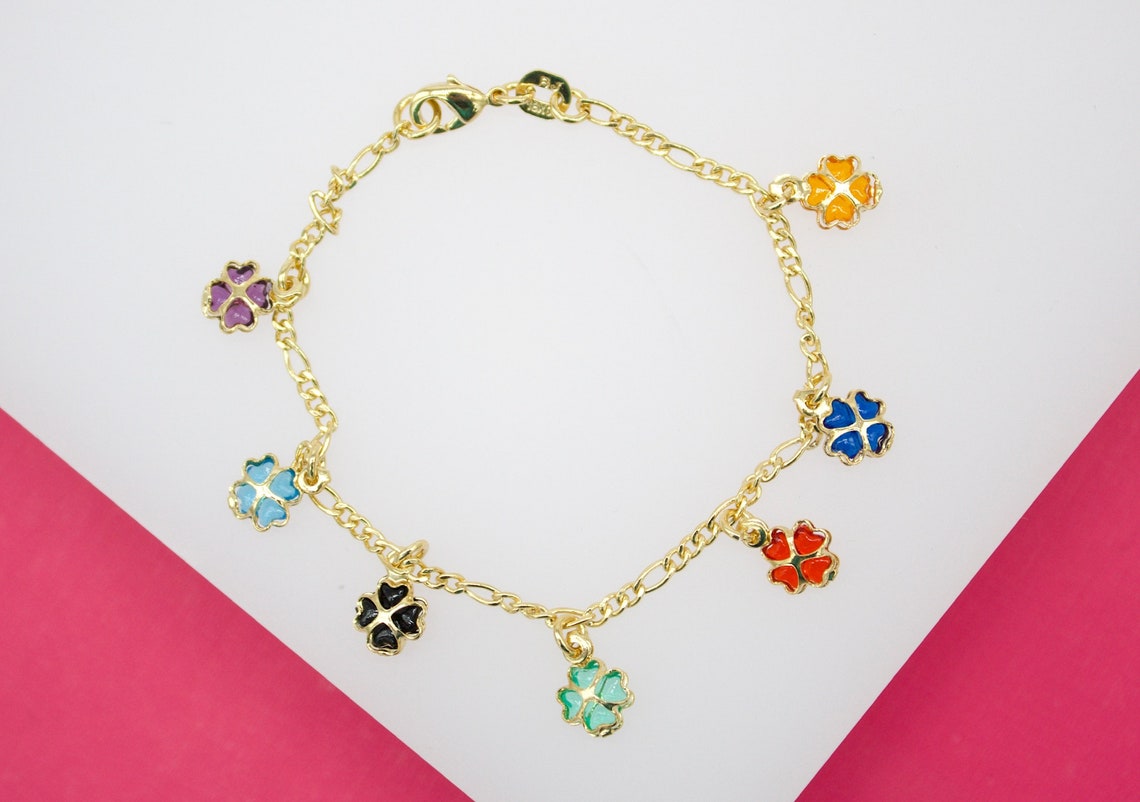 18K Gold Filled Dangle Multicolor CZ Four Leaf Clover Figaro Bracelet (XX15)