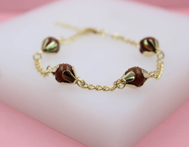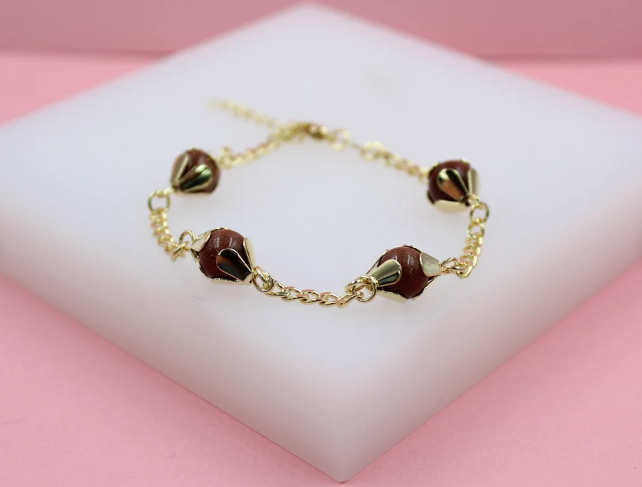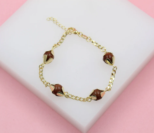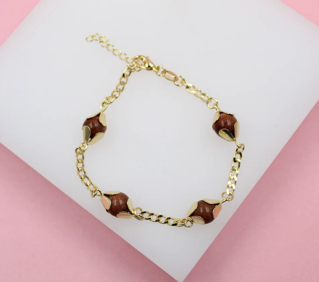 18K Gold Filled Designed Brown aventurine Bead Link Connector Bracelet (I442)