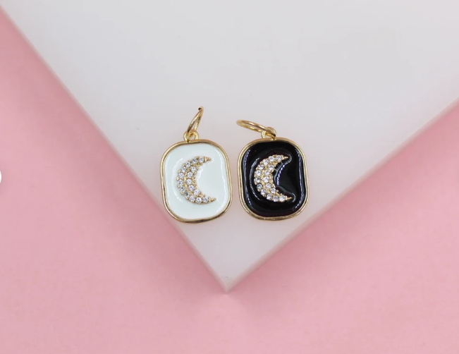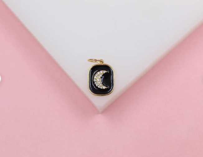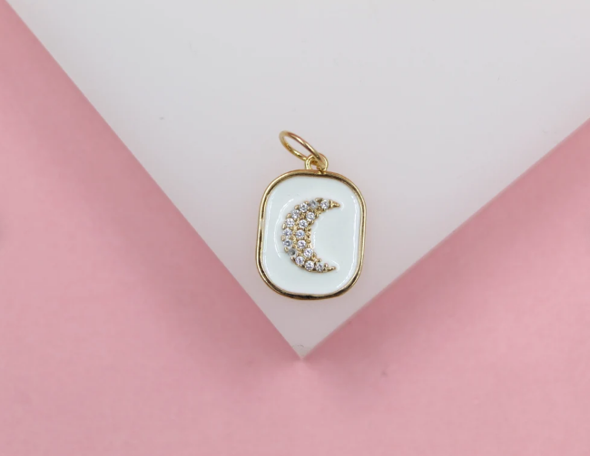18K Gold Filled Enamel Pendant Charm With Crescent Moon Shaped Micro CZ Cubic Zirconia Stones