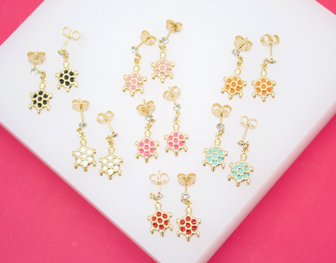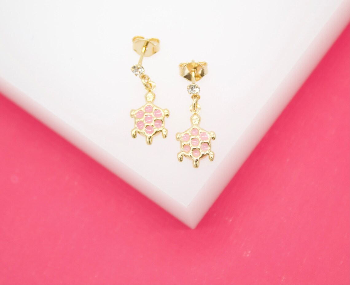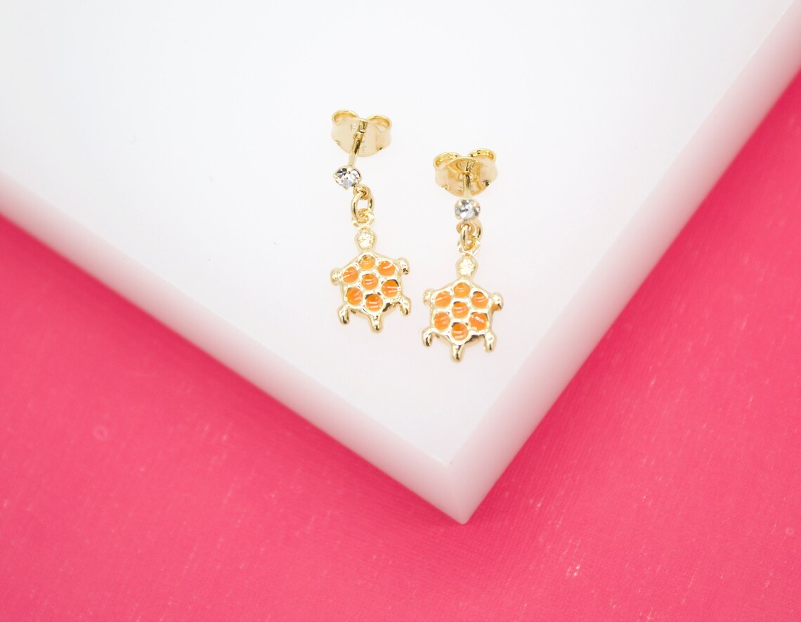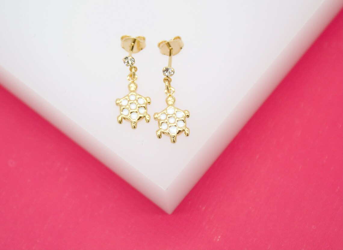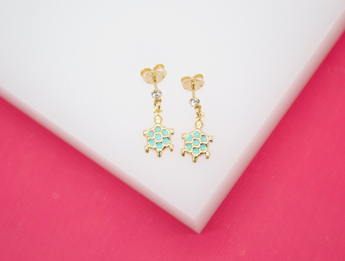 18K Gold Filled Enamel Sea Turtle Dangle Stud Earrings With CZ Stones (L115)