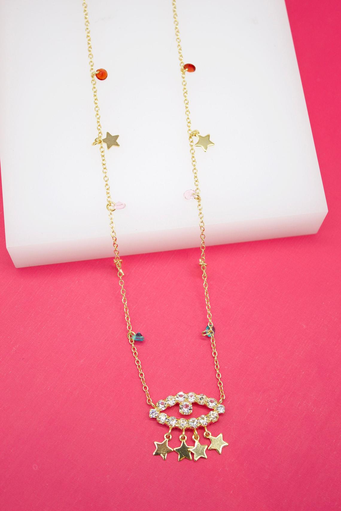 18K Gold Filled Evil Eye Pendant With Clear And Multi Color CZ Stones and Rolo Chain Necklace