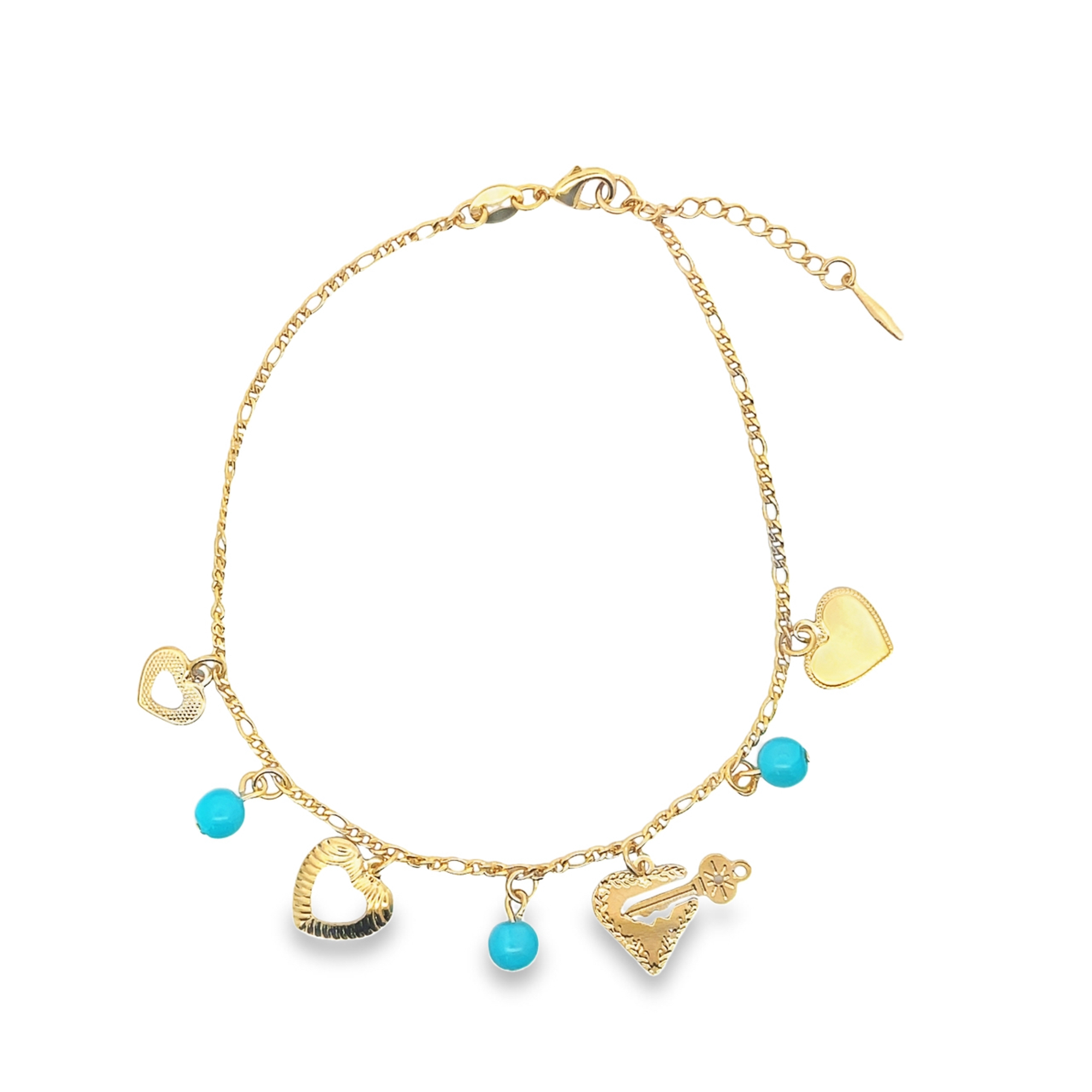 18K Gold Filled Heart Charm Blue Beaded Bead Anklet With Red Heart Stones (E105)