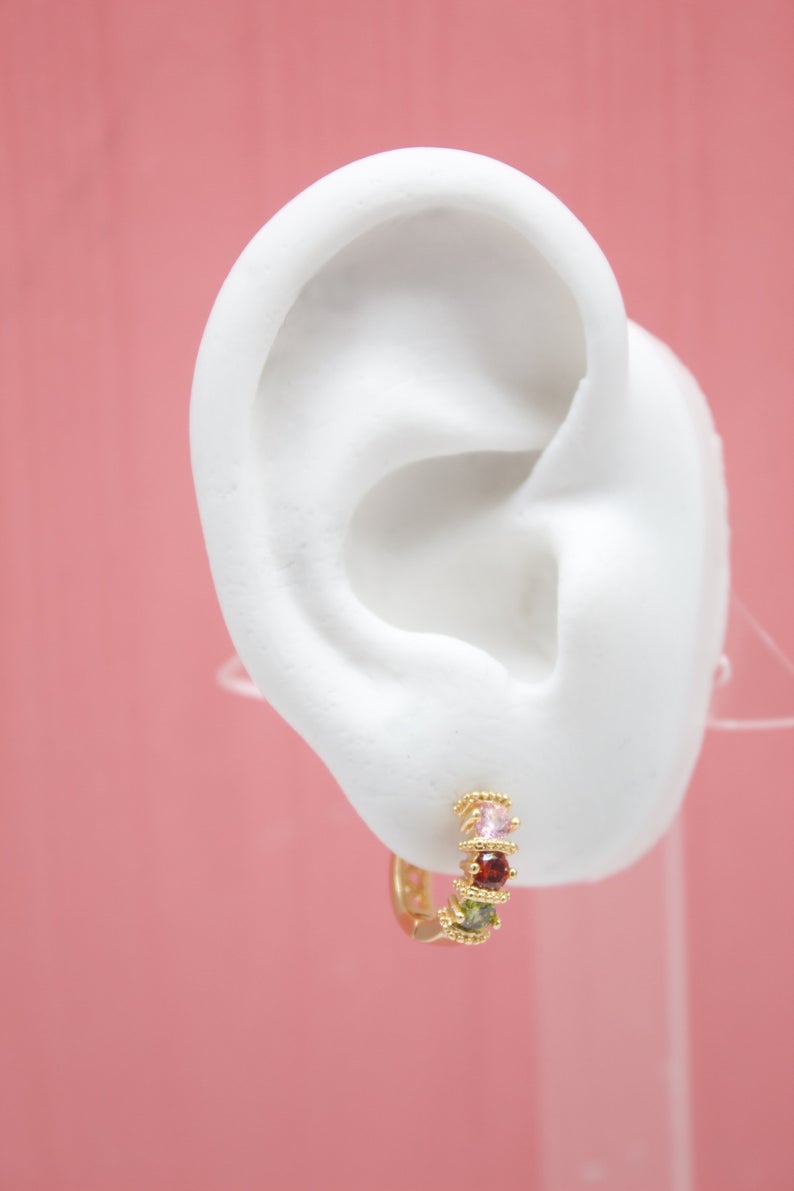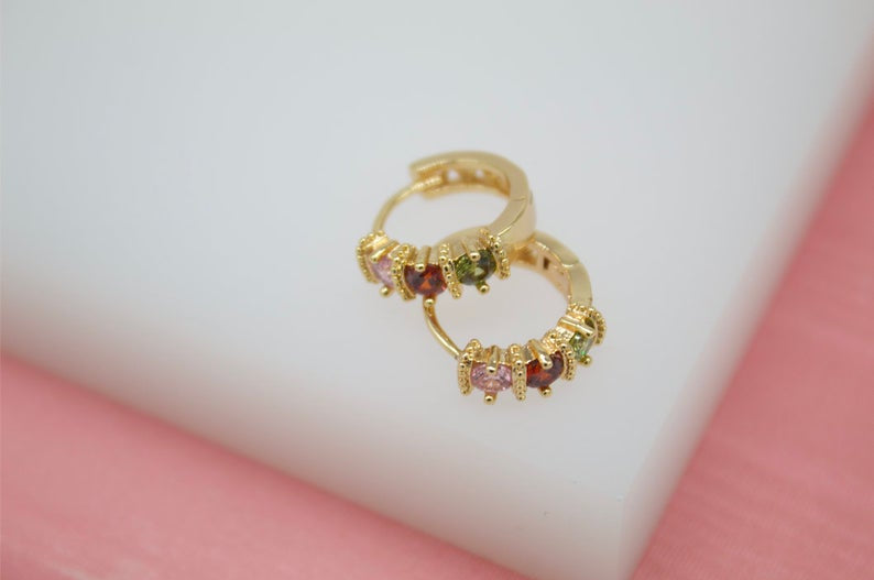 18K Gold Filled Huggies Earrings With Round Multicolor Circle CZ Cubic Zirconia Stones (STYLE P)