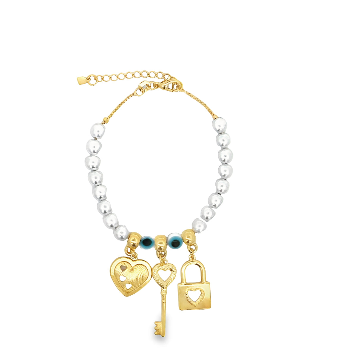 Pearl Adjustable Bracelet with Heart & Lock Charms (I278)