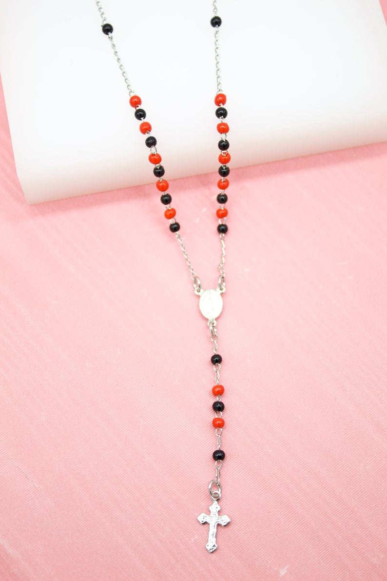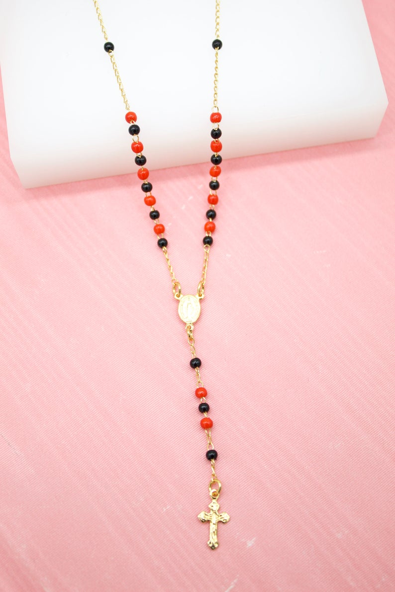 Get blessed with our 18K Gold Filled Red And Black Bead Rosary! This stunning piece features a crucifix cross and delicate red and black beads, providing both style and spirituality. Perfect for any occasion, this rosary will surely bring positive energy and style to your day.