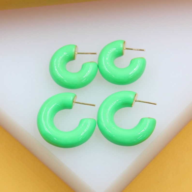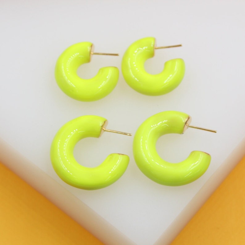 Unleash your inner risk-taker with our 18k Gold Filled Neon Enamel Hoop Earrings. These bold hoops feature thick gold plating and vibrant neon enamel, adding a pop of color and adventure to any outfit. Take on the day with confidence and style.