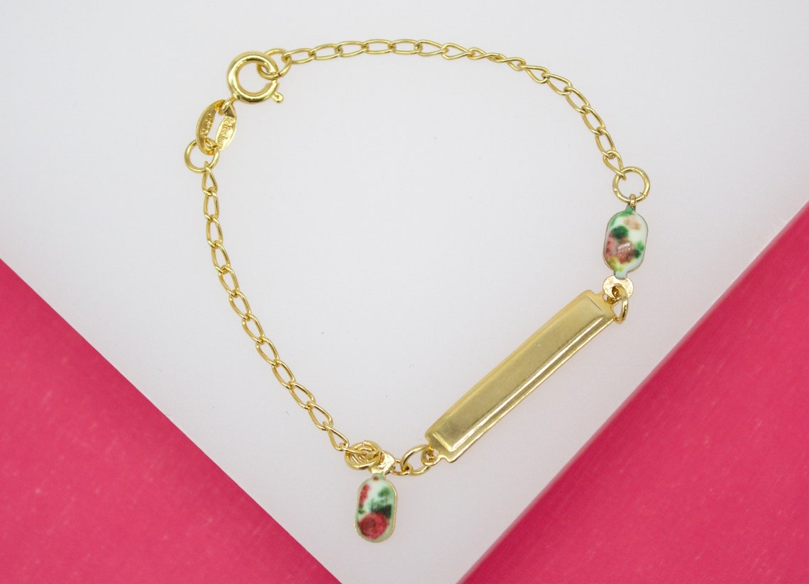 Indulge in this Gold Filled Vintage Enamel flower Dangle Charm Bracelet, accented with a delicate plate for a touch of elegance. Adorned with intricate enamel flowers, this piece exudes sophistication and charm. Elevate any outfit with this one-of-a-kind bracelet, perfect for any luxury fashion lover.