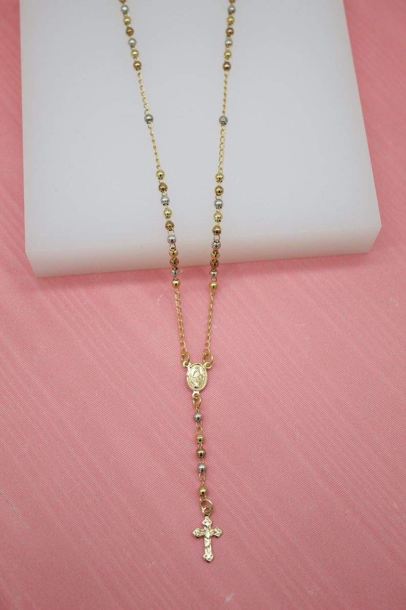 This 18K Gold, Rose Gold, and Rhodium Filled Catholic Gold Bead Rosary features a beautiful Crucifix and Virgin Mary charm. Made with high-quality materials, this rosary is a classic and stylish way to show your faith. Its durable design ensures it will be a cherished piece for years to come.