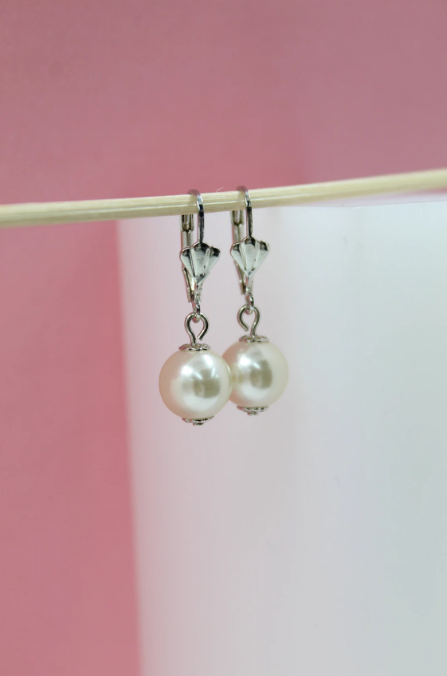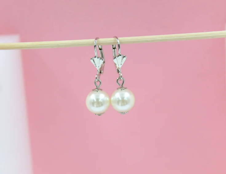 18K Rhodium Filled Synthetic Pearl Dangle Drop Hoop Earrings (L54)