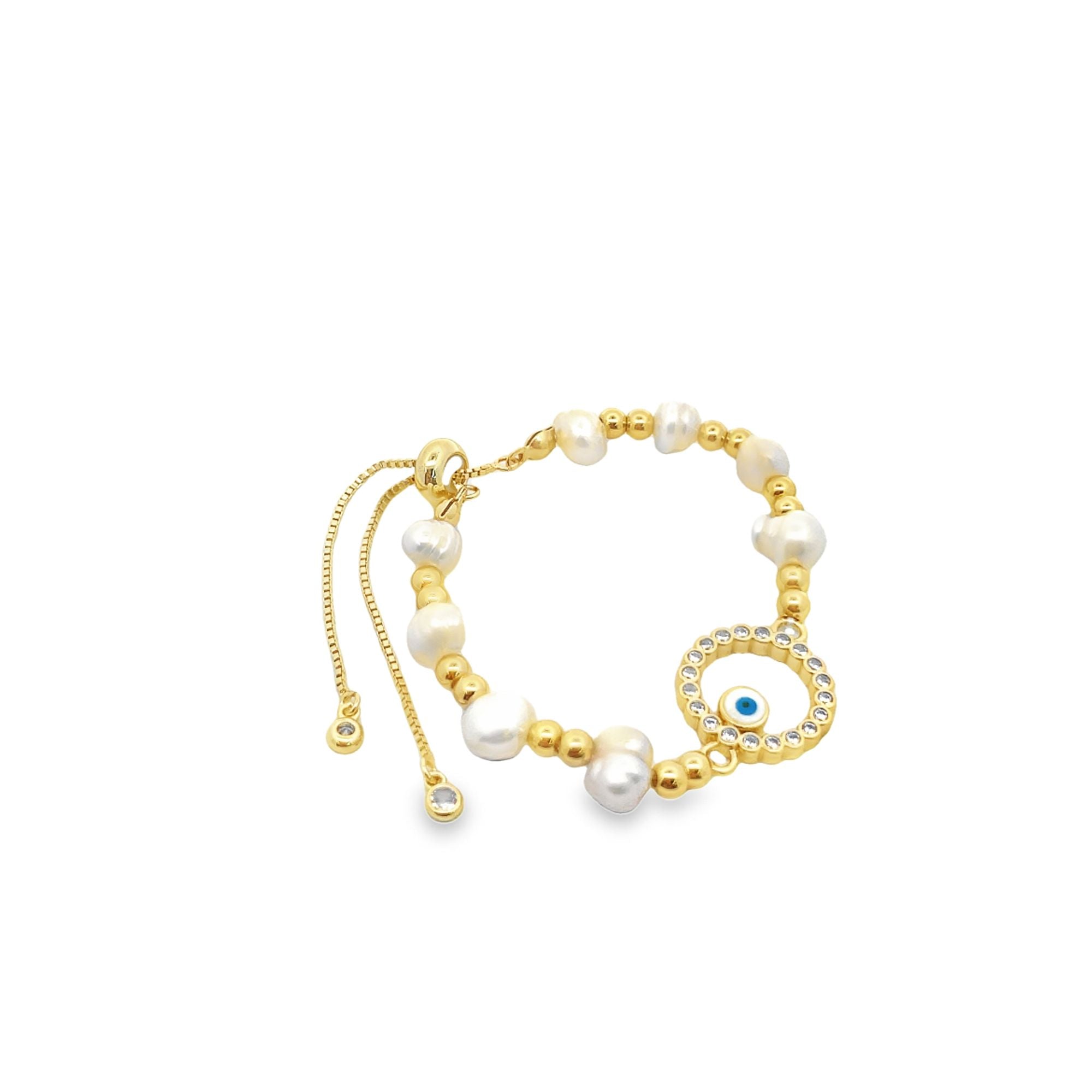 CZ Evil Eye Hollow Circle Shape Fresh Water Pearl Adjustable Beaded Protection Bracelet (I601)