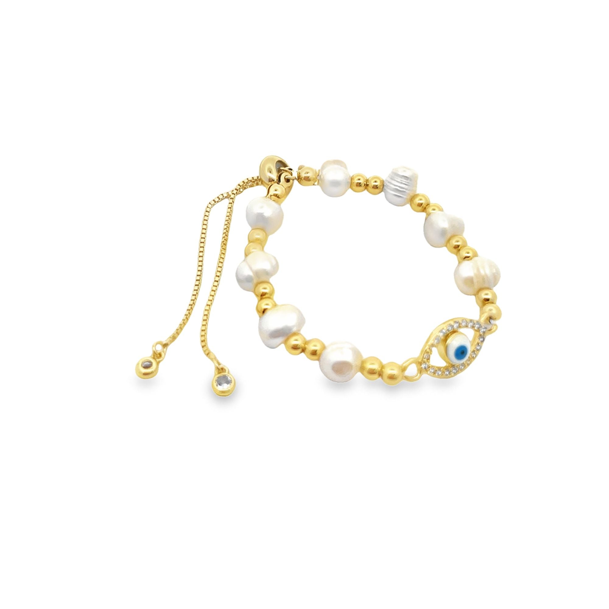 18K Gold Filled CZ Evil Eye Shaped Fresh Water Pearl Adjustable Beaded Protection Bracelet