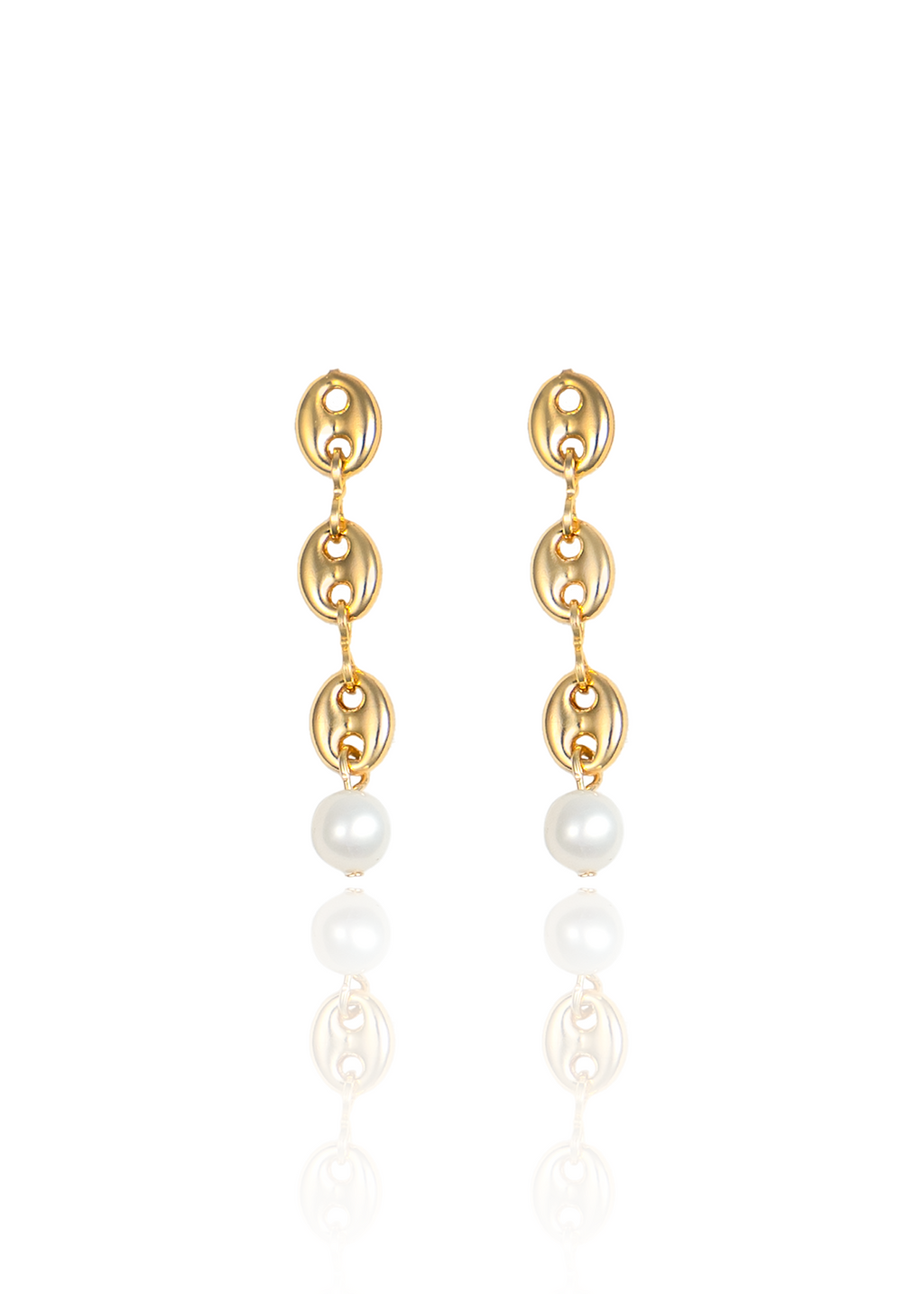Gold Puffed Mariner Link Earrings With Freshwater Pearl Dangle Drop (K289)
