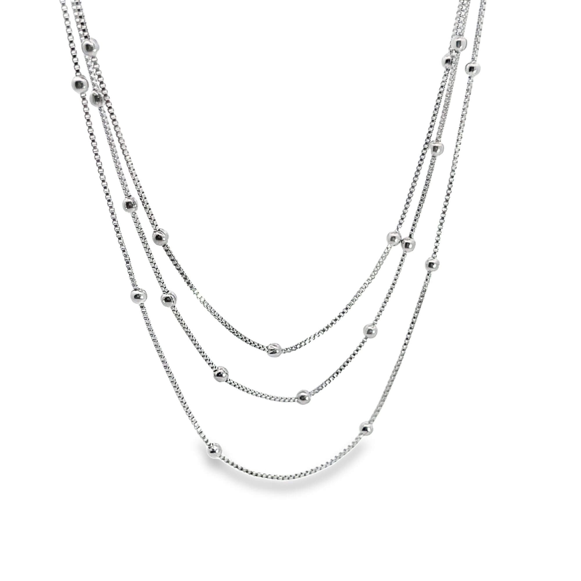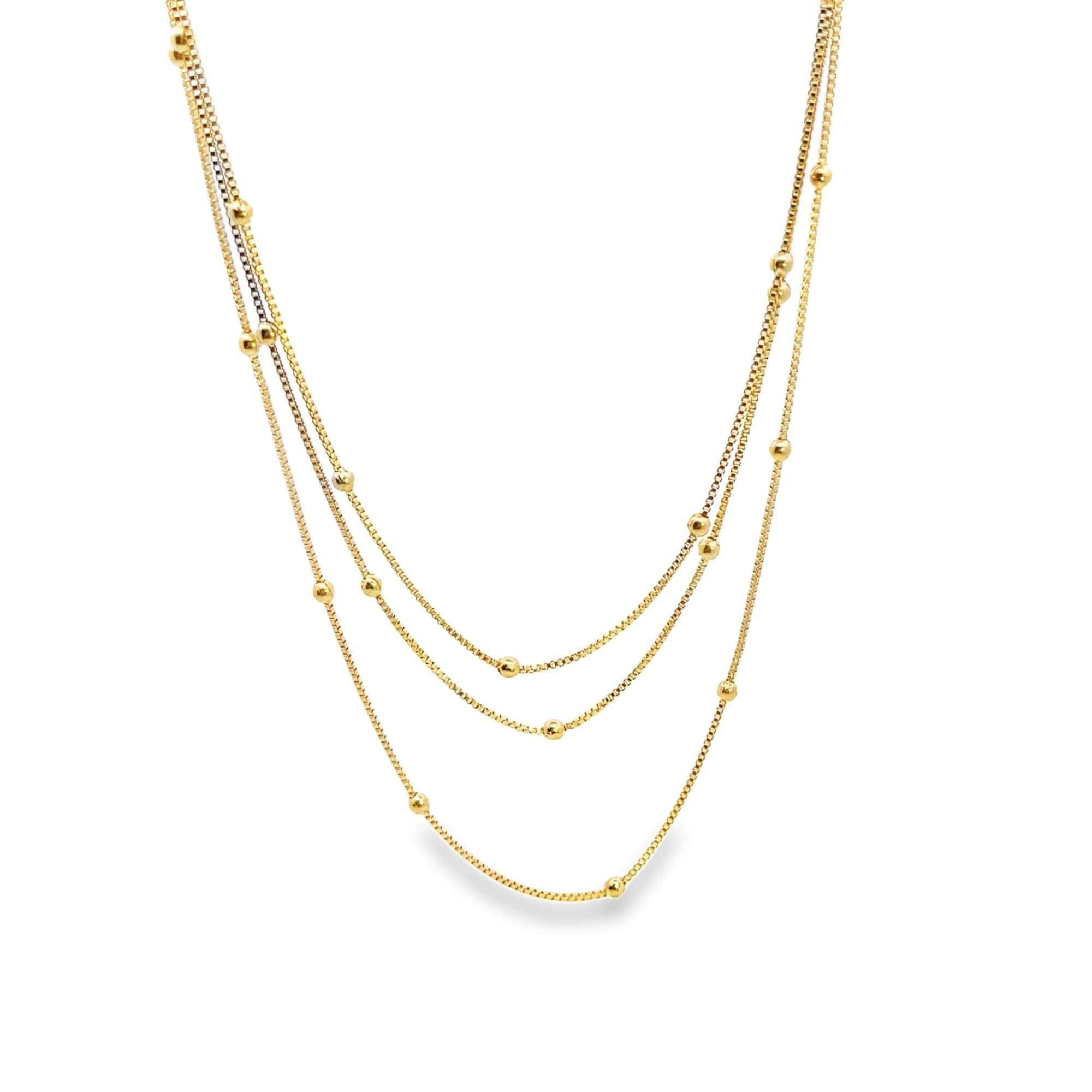 Indulge in luxury with our Triple Layered 1mm Box Chain Necklace With Beads. This elegant and exclusive piece features three delicate 1mm box chains adorned with a row of stunning beads. Perfect for elevating any outfit, this necklace combines sophistication and style. Treat yourself to the ultimate accessory.