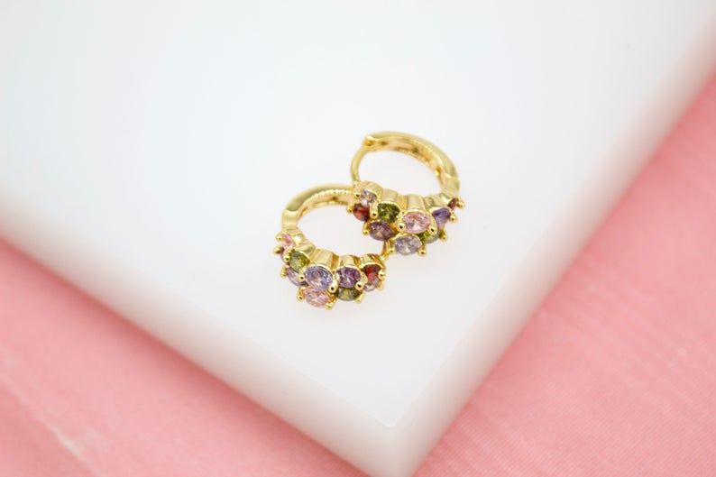18K Gold Filled Huggies Earrings With Round Multicolor Circle CZ Cubic Zirconia Stones (STYLE P)