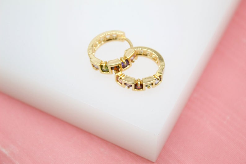 18K Gold Filled Huggies Earrings With Multicolor Rectangle CZ Cubic Zirconia Stones