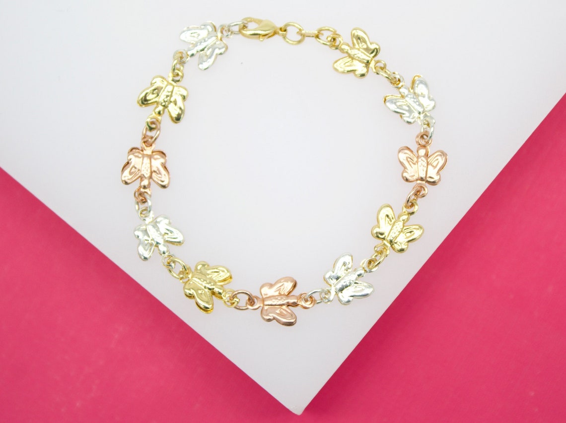 Experience the beauty and luxury of our 18K Gold Filled Three Toned Butterfly Bracelet. Crafted with precision and care, this bracelet features a stunning three-toned butterfly design that is sure to catch everyone's eye. Add a touch of elegance to any outfit with this exquisite piece.