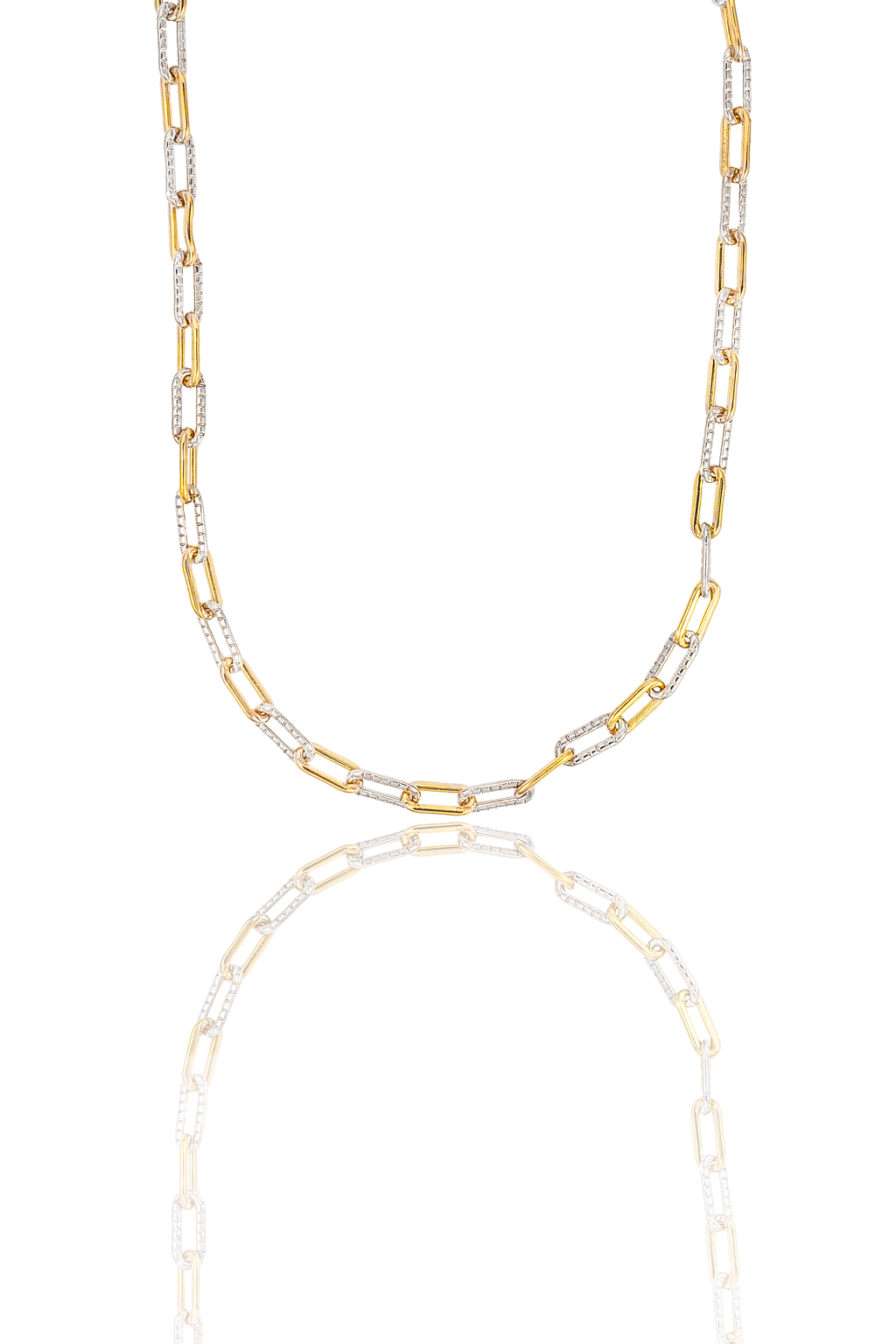 Elevate your style with our Two Tone Textured Paperclip Bracelet. Crafted with luxurious materials, this bracelet exudes elegance and sophistication. Its unique design of interlocked paperclip shapes adds a touch of modernity to any outfit. Make a statement and add a sophisticated touch to your look with this must-have accessory.