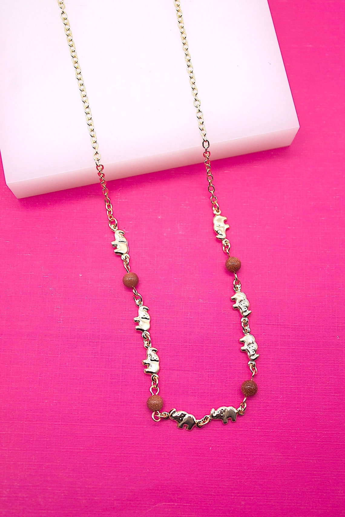 18K Gold Filled Brown Aventurine Beads With Elephant Charms Necklace