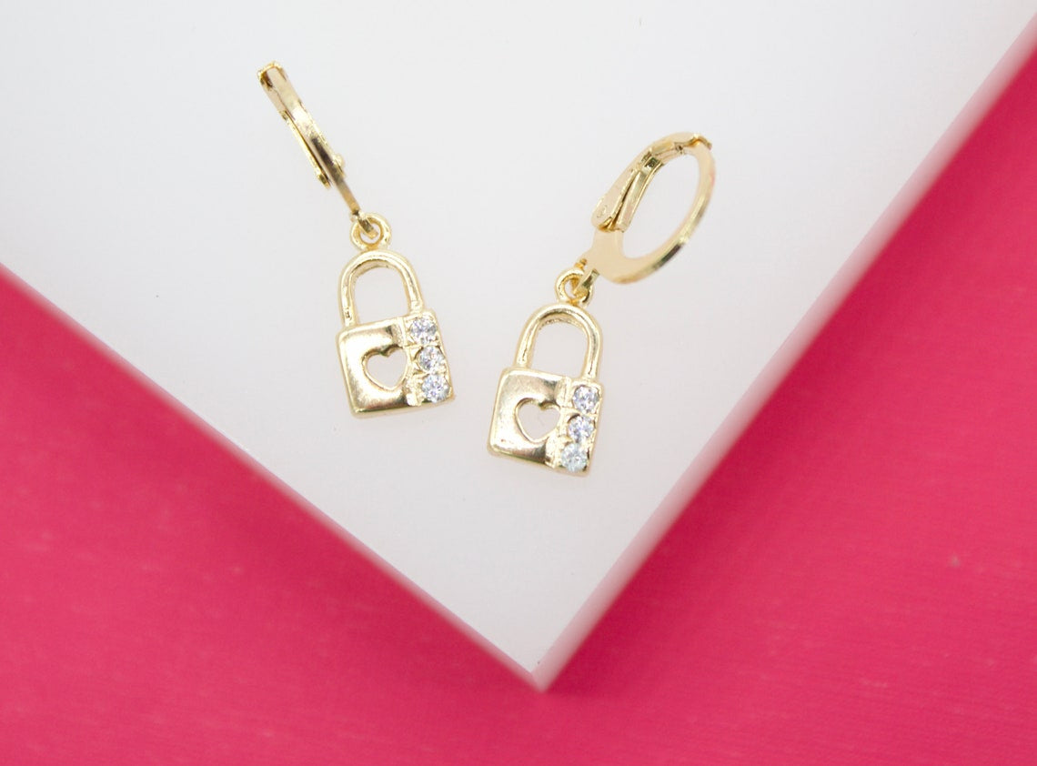18K Gold Filled Pave Lock Heart French Lever Back Earrings (L160)