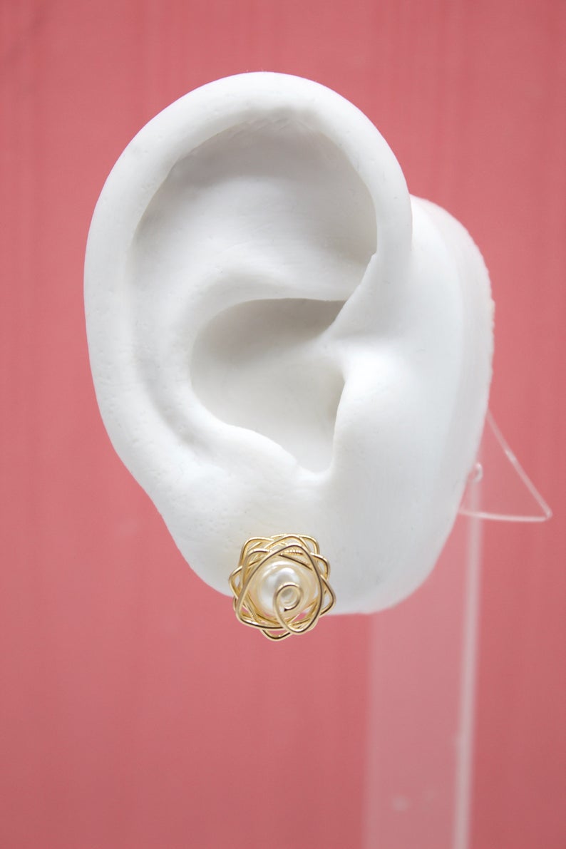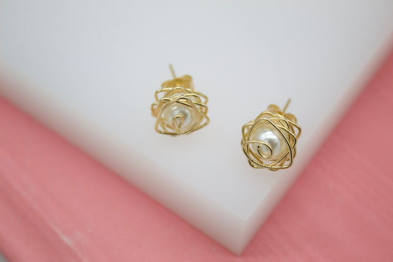 18K Gold Filled Pearl Stud Earrings With Golden Wraps (L128)