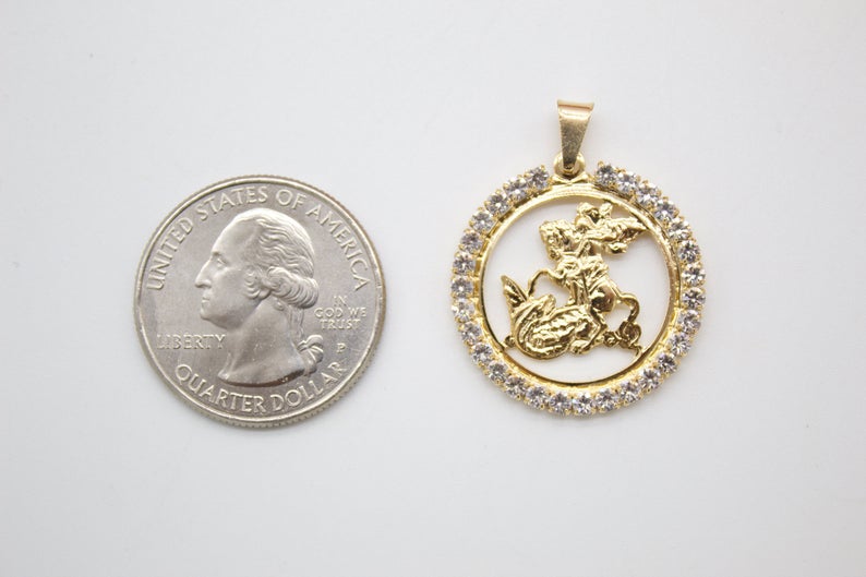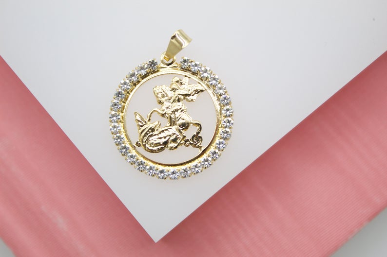 Introducing the Saint George Pendant, crafted from high-quality gold-filled material, measuring 25mm x 25mm. This exquisite piece symbolizes bravery and faith.