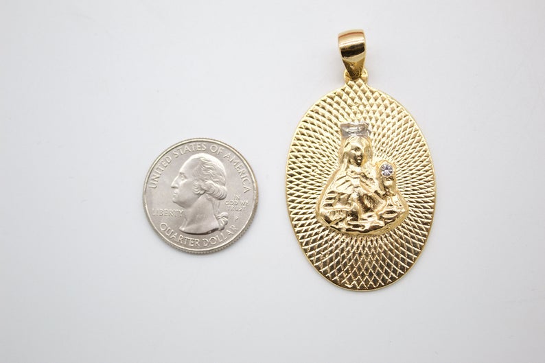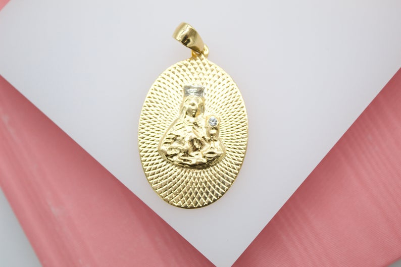 Discover the elegance of our Saint Virgin Mary Oval Pendant, featuring stunning cubic zirconia accents. Measuring 45mm x 30mm and crafted from high-quality gold-filled material, this pendant is perfect for showcasing devotion and style.