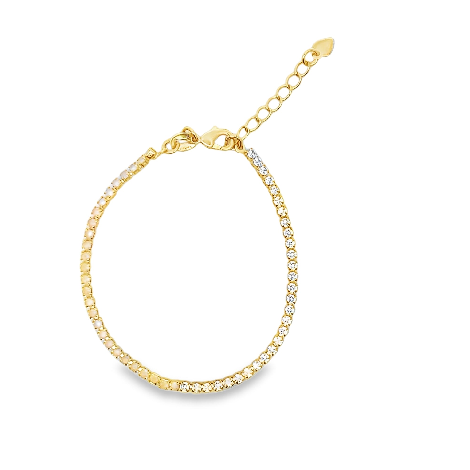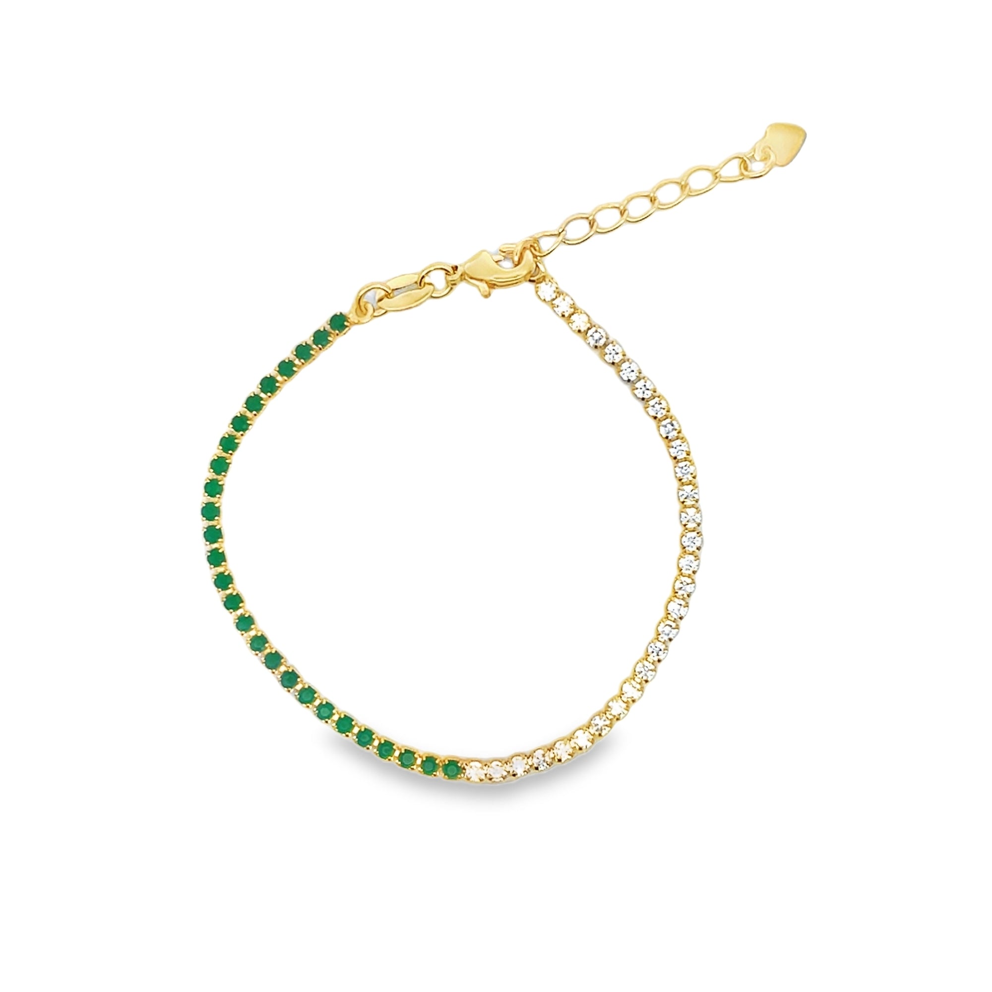 Crafted in a rich gold-plated setting, this bracelet features alternating rows of sparkling clear CZ stones paired with vibrant colored stones The symmetrical two-color design creates a bold contrast while maintaining a timeless tennis bracelet silhouette.