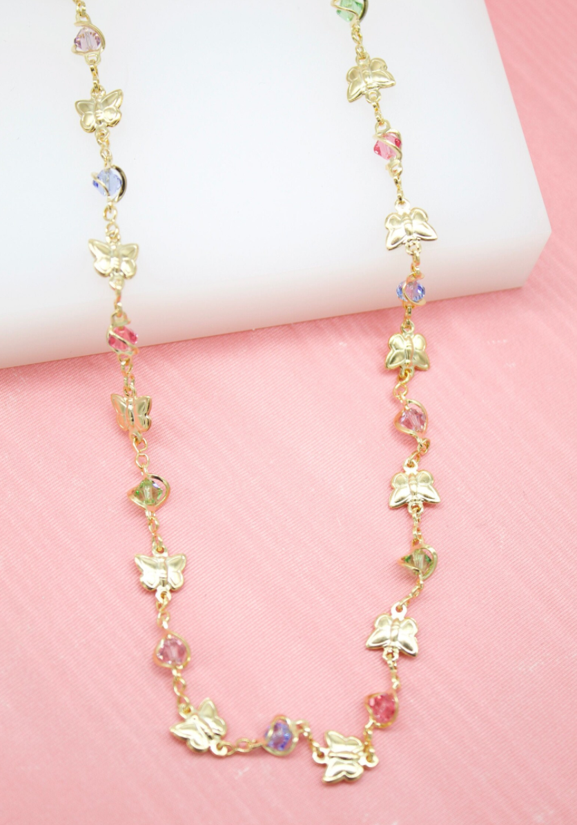 Multicolor CZ Stones With Butterfly Charms Link Necklace (G12)